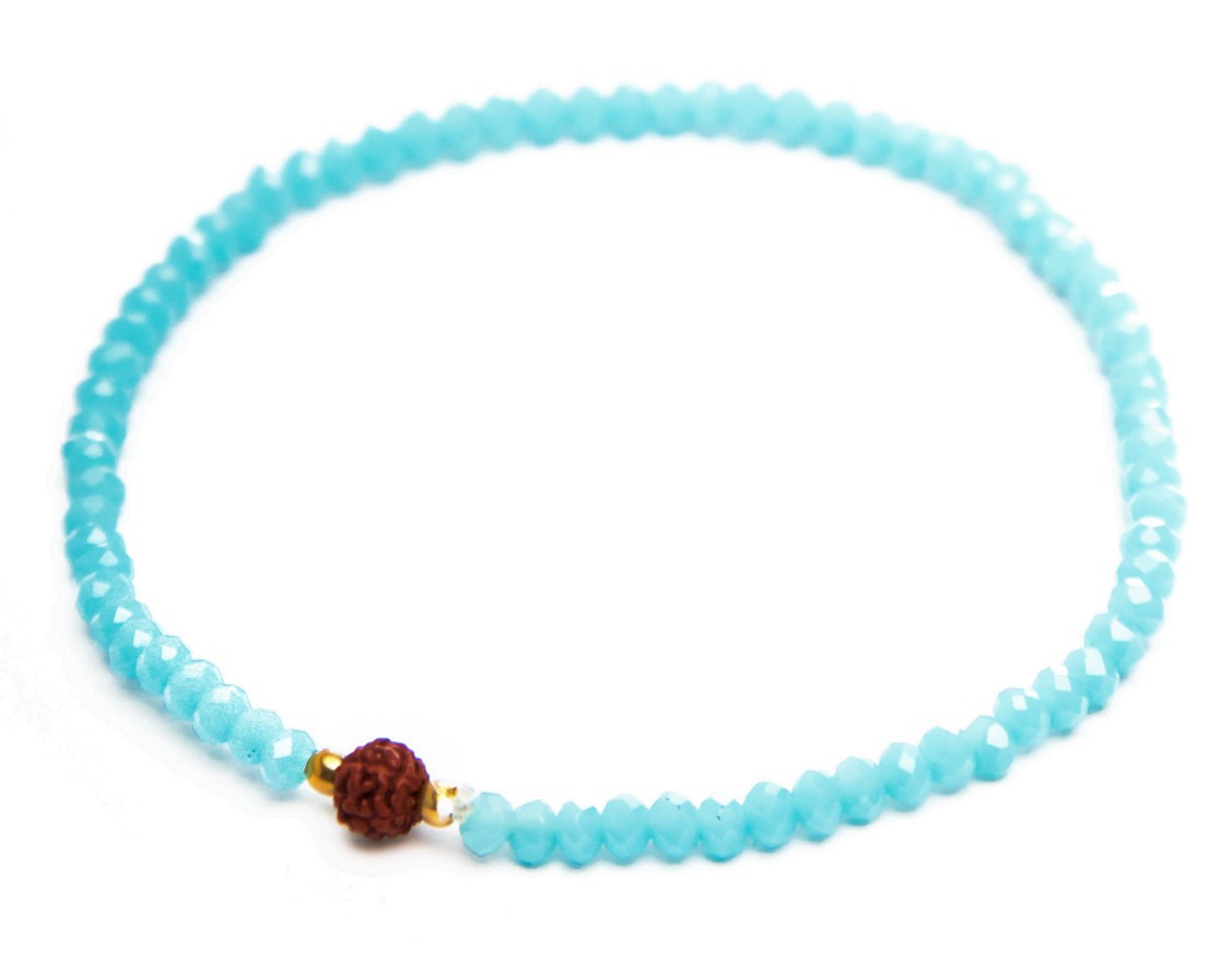 Beautiful crystal bead bracelet featuring single Rudraksha bead between metallic and crystal beads.