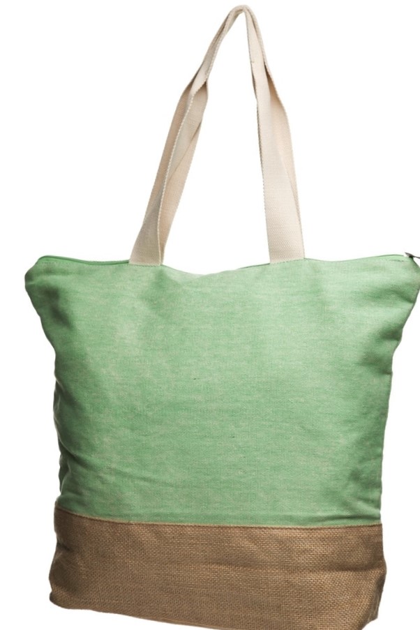 Large pastel beach bag with top zipper and wide straps. Fully lined with internal pouch.